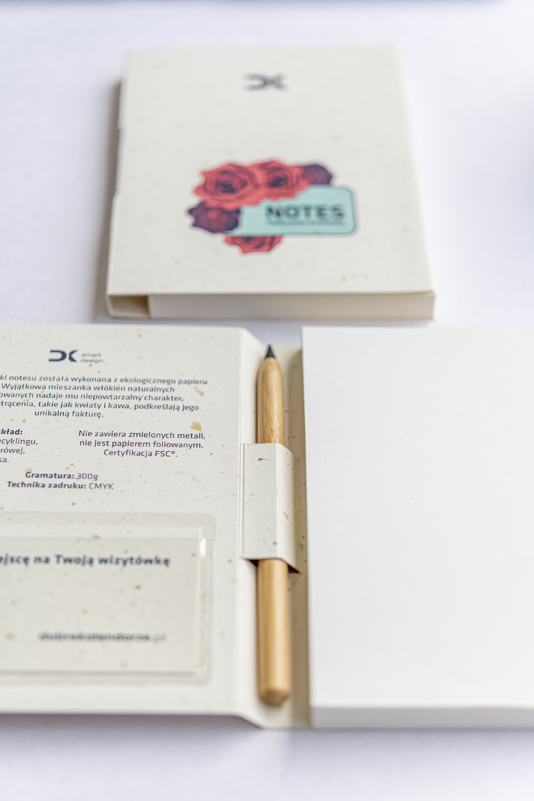 - Przezroczysta kieszonka na wizytówkę – idealne miejsce na personalizację notesu. Dzięki niej każdy egzemplarz może stać się narzędziem w pełni dopasowanym do właściciela – od pracowników korporacji, przez partnerów biznesowych, aż po uczestników konferencji.