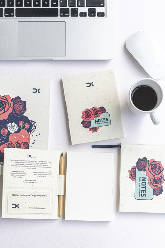 Linia Natura od DK smart design to odpowiedź na takie właśnie potrzeby. Notesy i terminarze powstają na podstawie ekologicznych papierów z dodatkiem włókien naturalnych, takich jak róża czy lilia. Każdy egzemplarz jest unikalny – faktura papieru delikatnie się różni, podkreślając naturalne pochodzenie materiału.